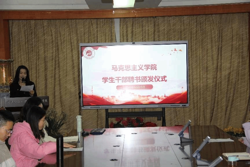 为进一步增强学生干部的身份认同感、归属感和荣誉感,促进学生干部快速成长,11月15日上午,德赢AC米兰官网在东配楼201会议室举办学生干部聘任仪式。会议由文体部干事李佳乐主持,德赢AC米兰官网党委书记武猛、党委副书记徐喆出席仪式,及全体马院学生干部参加仪式。