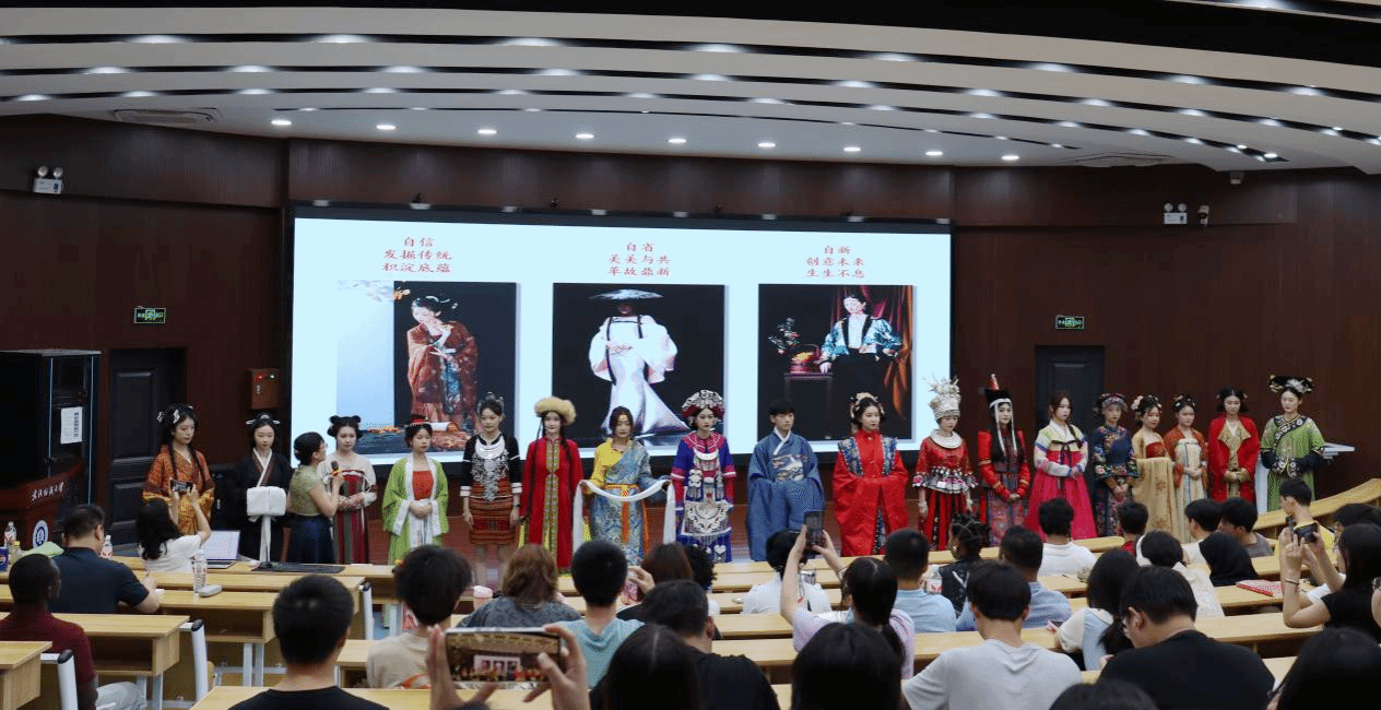 授课各阶段均进行穿插式的现场教学演示,由表演嘉宾倾情演示传统服装和民族服饰之美。丰富多彩的现场演示,使大家更深入地领略了中华服饰的魅力。最后,陶辉对青年学子提出了着装建议,强调日常着装是个人品位和修养的体现。她鼓励新时代青年学习传统服饰文化,提升自身审美素养和能力,并将其作为终身学习的能力。陶院长用“三自”总结了课程内容:“自信”——发掘传统,积淀底蕴;“自省”——美美与共,革故鼎新;“自新”——创意未来,生生不息。