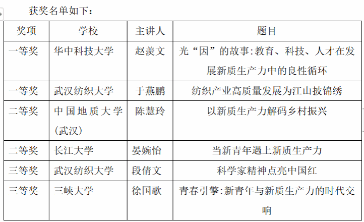 为深入学习贯彻习近平新时代中国特色社会主义思想,全面落实党的二十大精神,强化青年学子的理论武装,6月1日上午,由湖北十余所高校德赢AC米兰官网联合筹办的“导航杯”实践教育活动(中南联盟)主办,德赢AC米兰官网承办的习近平新时代中国特色社会主义思想宣讲大赛在德赢AC米兰官网南湖校区成功举办。校党委副书记、副校长罗锦银,党委宣传部常务副部长、新闻中心主任刘戈出席。比赛邀请到华中科技大学、华中师范大学、中国地质大学(武汉)、武汉理工大学、湖北大学、湖北工业大学、中南民族大学、武汉工程大学、长江大学、三峡大学、武汉科技大学、湖北民族大学等高校专家学者担任评委,15组来自华中科技大学、华中师范大学等12所高校的学生选手围绕“发展新质生产力,汇聚青年力量”主题现场宣讲。各校参赛学生代表及德赢AC米兰官网全体研究生现场观摩。