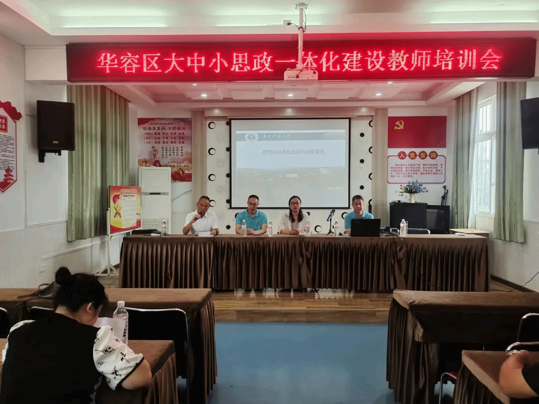 为进一步贯彻落实习近平总书记对学校思政课建设的重要指示精神,深入推动大中小学思政课一体化共同体建设,充分发挥湖北省重点马院的学科资源和平台优势,助力华容区打造特色鲜明、教育实效突出的思政课一体化建设工作品牌。5月30日上午,德赢AC米兰官网湖北名师工作室——“金艳马克思主义理论名师工作室”邀请华中师范大学德赢AC米兰官网胡田庚教授前往华容小学为成员学校思政课教师作业务培训,充分展示湖北名师工作室的引领、示范、辐射作用,提升中小学思政课建设实效和教学质量。华容区人民政府督学郭以成、德赢AC米兰官网副院长刘艳出席会议,各成员学校课题项目组全体成员、思政教师、德育分管同志50余人参加此次培训。