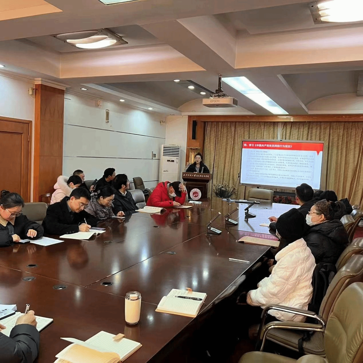 蒋彭阳同志先后对习近平总书记在二〇二四年春节团拜会上发表的重要讲话精神、习近平总书记在中共中央政治局第十一次集体学习时发表的重要讲话精神、湖北省纪委十二届三次全会精神以及《中国共产党党员网络行为规定》等内容进行分析,重点讲解了“新质生产力”等内容。