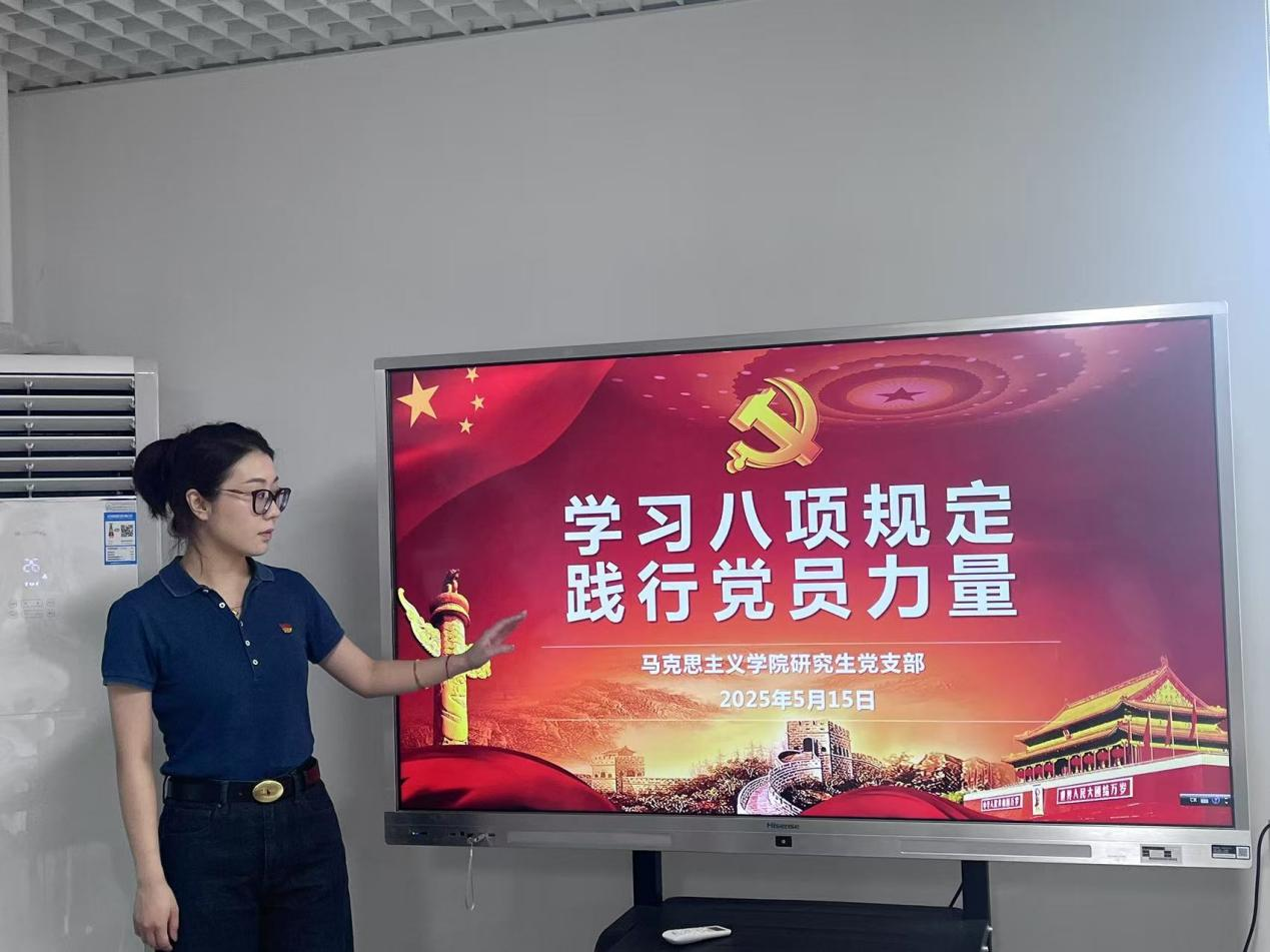 为扎实推进深入贯彻中央八项规定精神学习教育,强化党员作风建设,筑牢拒腐防变思想防线,5月15日下午,研究生党支部蒋彭阳带领支部学生党员深入开展了“学习中央八项规定,践行党员力量”主题党课学习。