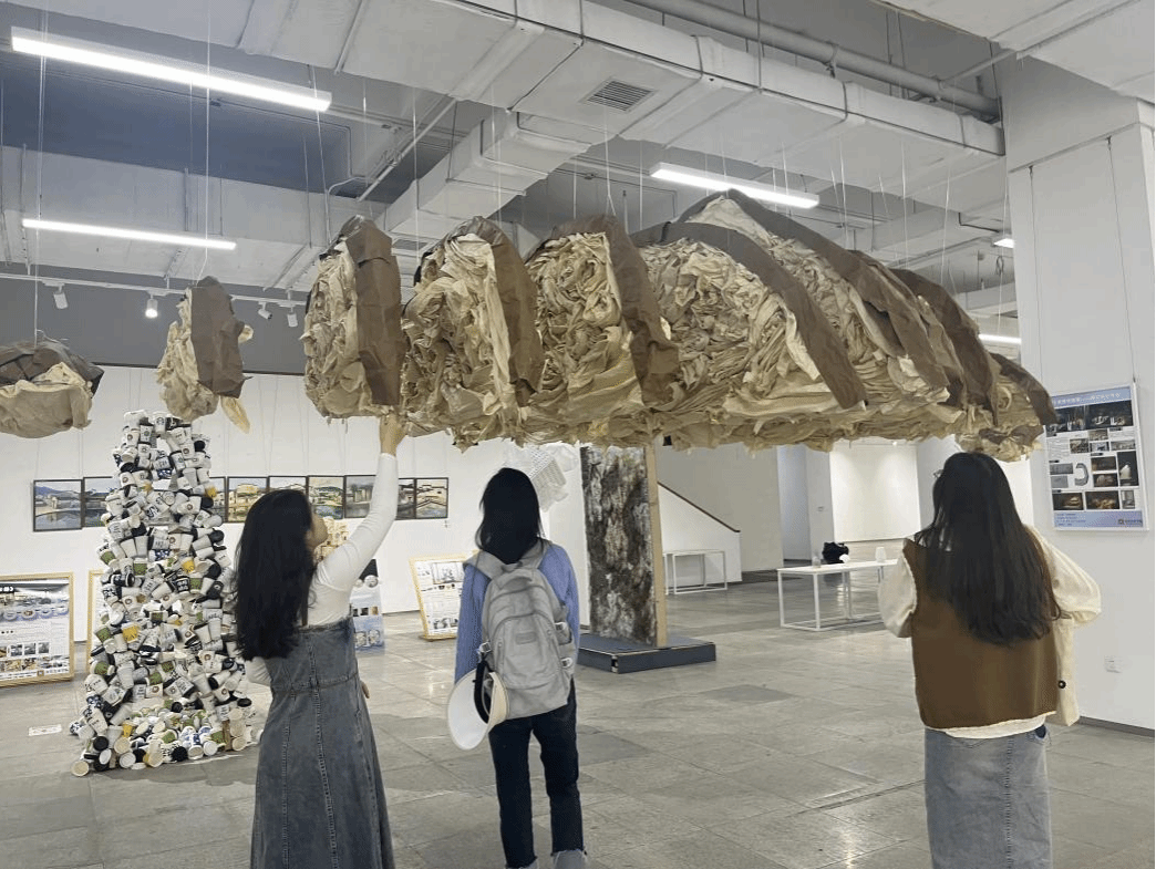 走进展厅,丰富多彩的艺术作品映入眼帘,不仅有传统的油画、版画、水彩画作品,还有现实与趣味兼顾的现代艺术作品与设计。激励人向上发展的咖啡《云梯》、写满祝福与愿景的独特中式艺术《现代百宝阁》、纪念南京大屠杀的艺术作品《前事不忘·后事之师》,以及各类多声装置艺术设计。展出作品形式多样、种类丰富,在参观过程中,同学们充分感受到艺术的魅力。